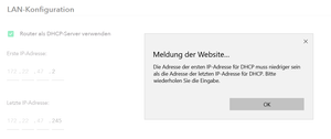 Ich hatte es auch schon mit 192.168.1.1 als Router und 192.168.1.10-50 als DHCP versucht. Es kommt die gleiche Fehlermeldung.