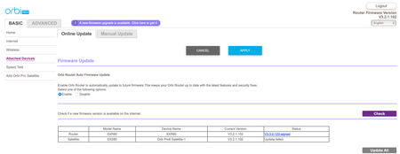 Just received, and am setting up my new Orbi Pro system which came with firmware version V3.2.1.102 installed. I'd like to update to the latest V3.3.0.122 firmware via the web interface but have bee...