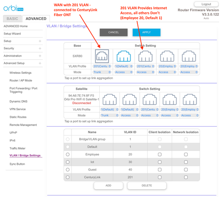 Help on configuring Wired ports for Internet access via Employee (20) VLAN - Orbi Pro 6