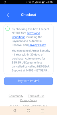 Using the NighHawk App on Android, version: V2.15.1.2104 Trying to pay for Armor Subscription using PayPal. "I accept NETGEAR Terms" is grayed"
