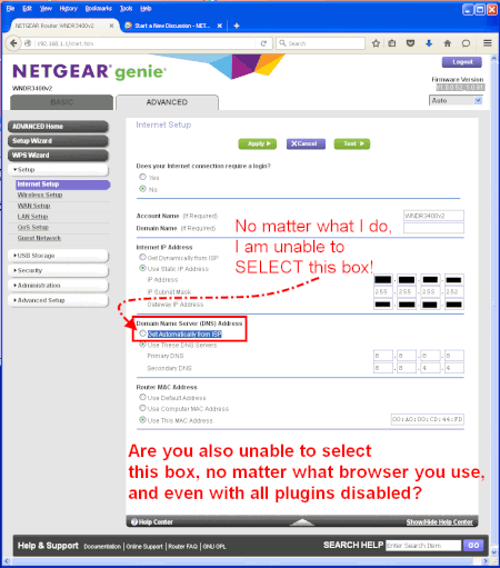 Can you test whether you can click this checkbox and report back whether it works for you, or if you see the same bug? For the life of me, I can't check the circle to set the router to get the DNS...
