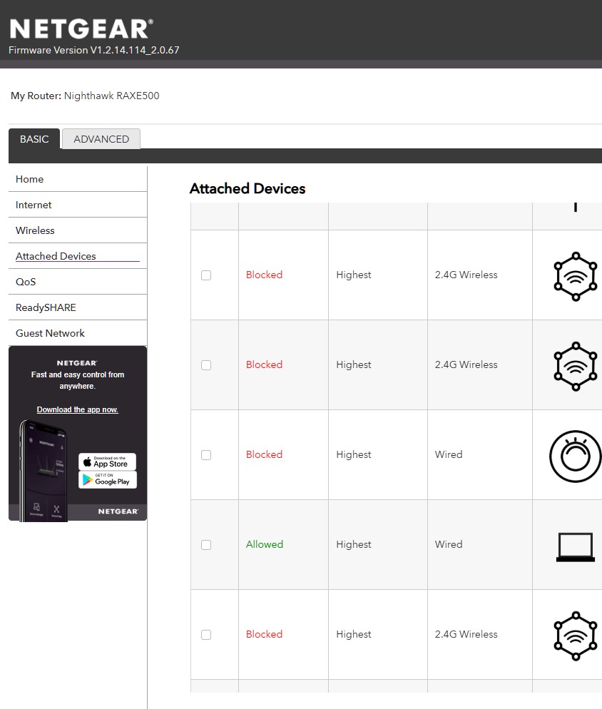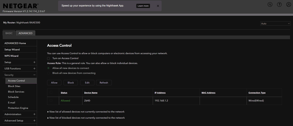 However....Now, devices on my network intermittently lose connection, when I enter the browser to check some show that they are now blocked....When i click access control, I get prompted to change this via the nighthawk app, but in the nighthawk app, this only shows a green light next to online dives, and there is no way to block or allow access for each device. I tried disabling remote access, so I could do this via the browser option, but the page briefly shows up, then disappears and i get the same message telling me to use the nighthawk app.
