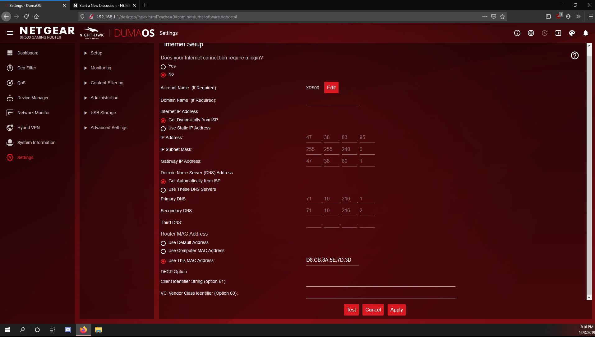 I just bought a Netgear XR500 and I seem to have a issue with the initial setup on netgear routers. Everytime I go to do initial setup it doesn't detect my internet connection. Yes I always power cycle the modem when installing a new router. For some reason I have to config myself to get past that part, then I reboot the modem and router and it works. It's currently using my computer's MAC address instead of the routers. Is there any way to fix this because I'm also getting only half of my download speeds. I'm no expert on this but I want to get it properly configured because I don't see why it has to use my computer MAC address in the first place. My only idea is that I originally had a linksys and replaced it a year ago with the R6400v2 and had the same exact issue. It's like my modem doesn't play nice with netgear routers or something. I attached a picture of my settings. If you need more info which I'm sure you will just let me know.
