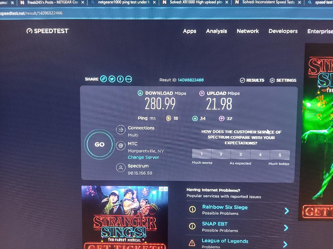 I recently purchased the xr1000 gaming router because I thought that was the issue I was having with my connection while playing games on my pc was my old router. While this router has a TON more features than my old one, I am able to try and narrow somethings down. I am not the most tech savvy person and this has been a process for me, but I need someone to help me out, and I'm starting to lean towards it being on my ISP end. After every time I do mess with it though and do a connection test it's the same result, good speed, good ping but horrible Ping under load and I have attached some pics of tests I have done. Also, when I do the test, it says my internet is 540ish download when all I have is 300 so whatever that's about.