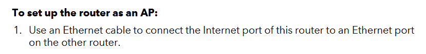 I hope this is the correct place to post this. I have a XR300 router. I have connected it with a LAN cable to AX4 router that I setup in AP mode. The XR300 will not connect to the AX4 router. (My old setup was a spectrum router with AX4 in AP mode. SSID and passwords are the exact same and it works great.) When I switch out to the XR300 as my main router the LAN light on the XR300 blinks red every 5 or so seconds on the port I have connected the AX4. When I put my old spectrum router back in place the AX4 router works great. The cable distance is about 100 feet. I brought the AX4 router next to the XR300 and connected it with a 6 foot cord and the LAN light light up white and seem to have connected. Took it back to my outside building and connected it the light went back to red and the AX4 has no access.