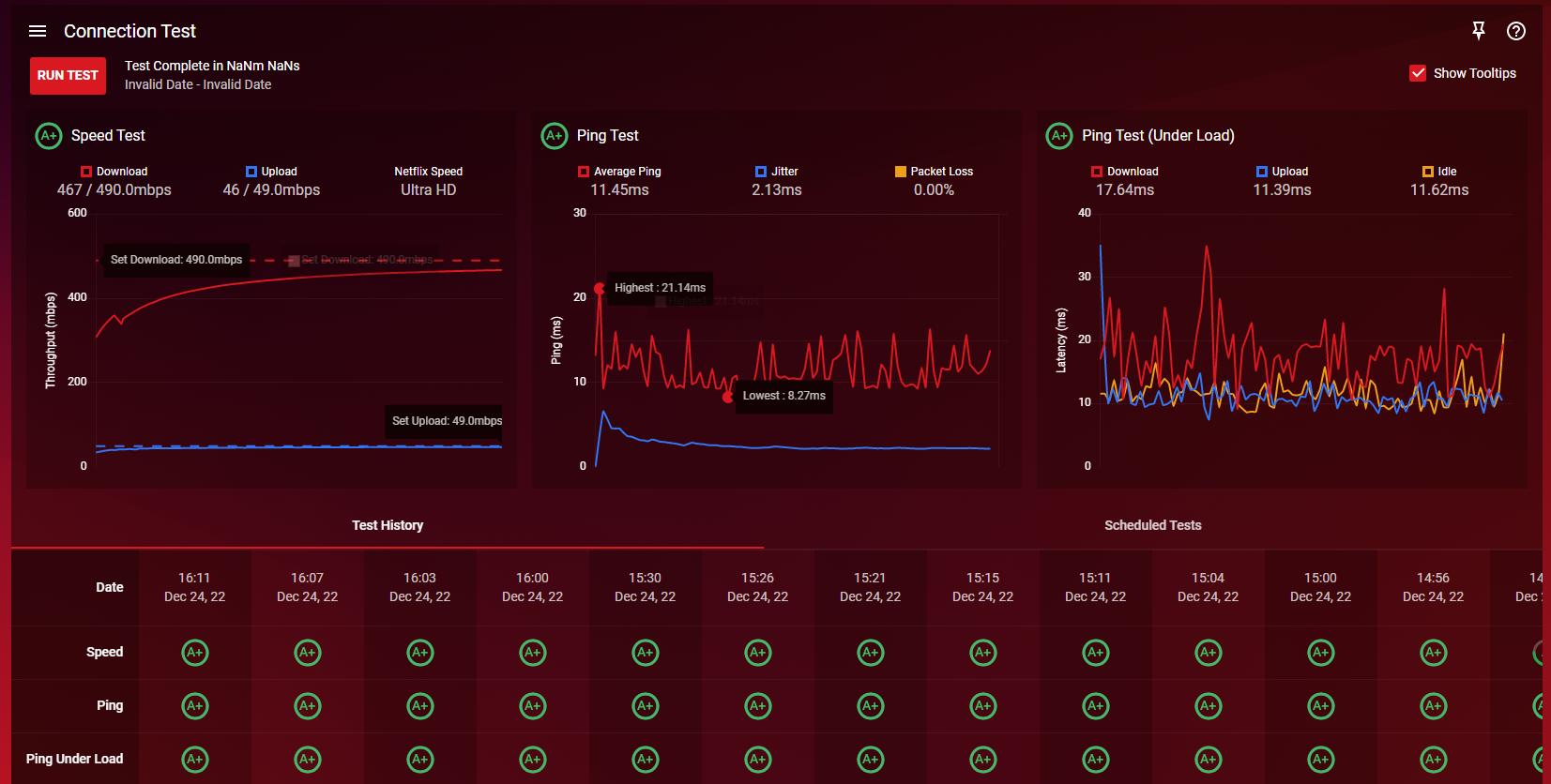 I've linked my best test result which was at 35mbps/5mbps from the in-built benchmark in attachments.