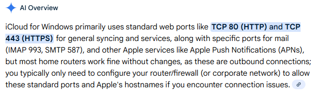 Hmmmm. Internet AI seems to think that iCloud for Windows typically does not require any modification to customer routers: