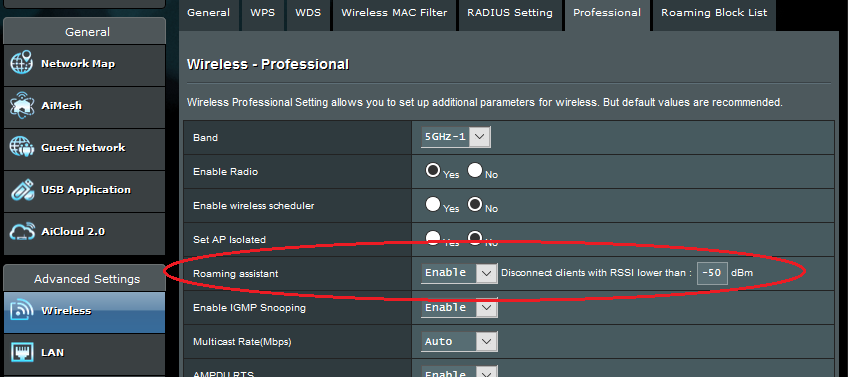 In my experience with the Asus AX mesh system I use "Roaming assistant: Enable" and the signal threshold "Disconnect clients when RSSI lower then: -50 dBm".