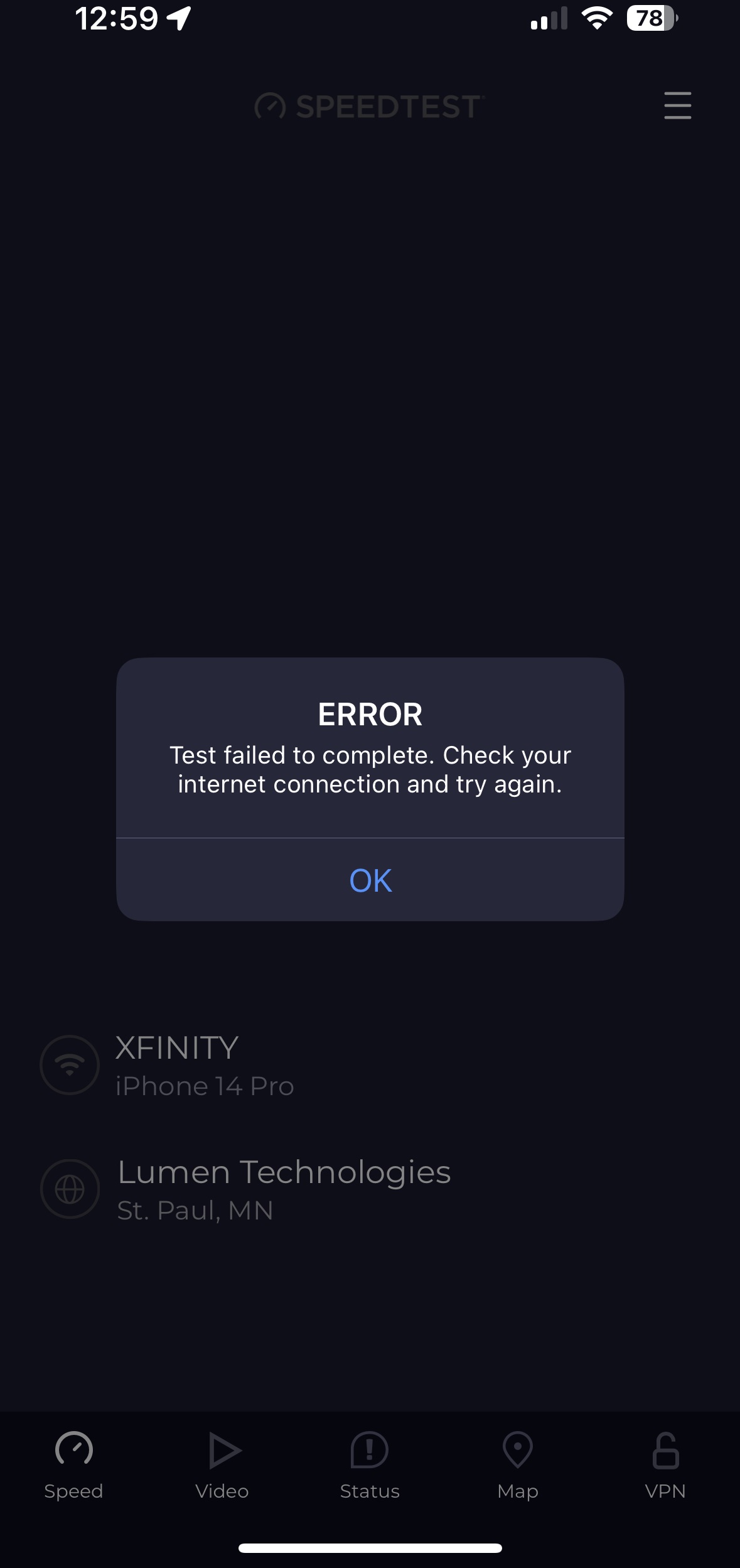 Here is the screenshot from the speedtest on my iphone. It doesn't even complete, it errors out. But as you can see in the upper right, the WiFi signal is strong. From running pings from a laptop in the same location, and from Zscaler on my work laptop, I can see that the WiFi connection drops regularly.