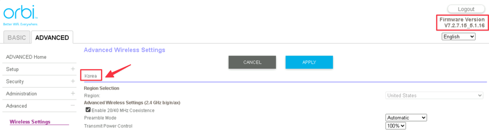 I see "Korea" in Orbi -> Advanced -> Wireless Settings. I am from US region, can someone explain why this text exist and there is no option to change it.