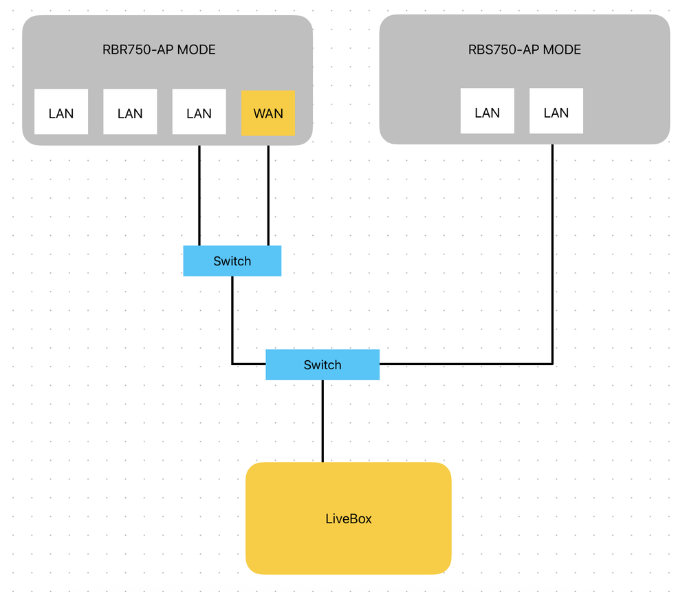The Livebox is indeed my internet service provider's router. From this router, I only have one network cable to connect the RBR750. So I'm going to plug it into the LAN port, as shown in the new diagram.