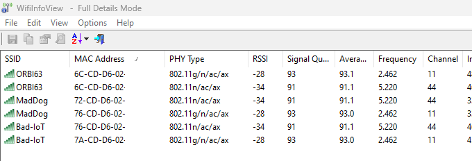 The point of checking the actual MAC address of each WiFi access point that is broadcasting this SSID is to determine exactly which Orbi units are broadcasting the IoT SSID. On Android phones/tablets, I like to use WiFi Analyzer by Kevin Yuan (there are dozens of similar apps). On Windows, the free WiFi Info View by Nirsoft is really convenient because there is an Advanced setting where I enter the specific SSIDs to look for (in this case the primary WiFi SSID and the IoT SSID). That keeps all the neighborhood WiFi systems from distracting me. Then, click on the heading for the MAC column and they all get sorted by MAC address. Each WiFi access point has one hardware MAC address and the Orbi creates "pseudo" MAC addresses for the various activities. 2.4G gets one variation. 5G gets another. The physical hardware LAN another, etc.