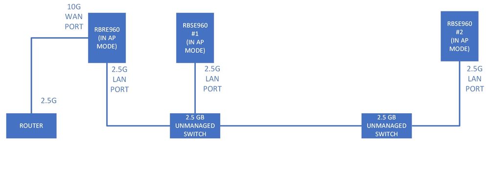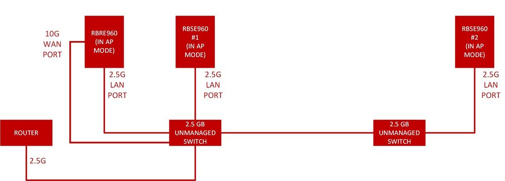 I have one RBRE960 and two RBSE960 satellites, all in Access Point mode. I am trying to set up wired backhaul between all three through a couple of unmanaged 2.5GB switches, and it's driving me crazy.