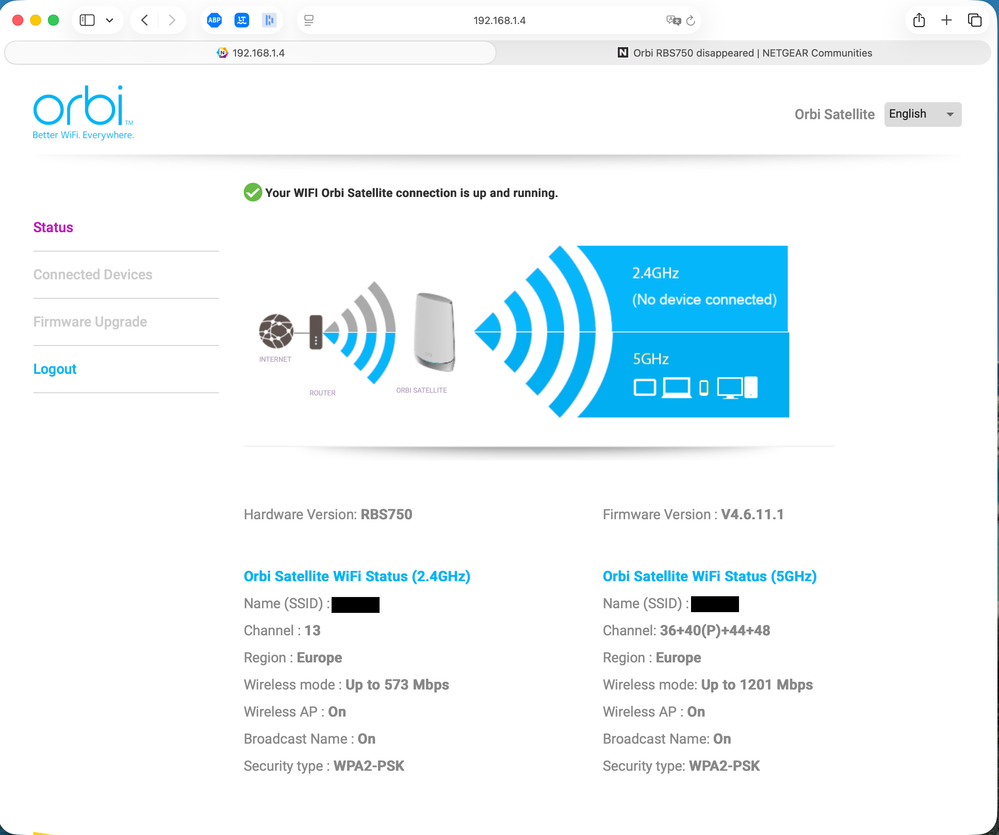 I understand that you are not able to see the satellite listed under devices from your router GUI page. This is due to the RBS750 firmware version 7.2.7.15 being incompatible with the NBR750. To resolve this issue, connect your computer directly to the satellite using an ethernet cable. Then, change the IP address on your computer from DHCP to static using the IP address 192.168.1.1 and subnet mask 255.255.255.0. Next, open your browser and type 192.168.1.250 in your search bar to navigate to your satellite GUI. A prompt for a username and password will appear (use the same credentials used to log into the router GUI). Then navigate to firmware update, then use the most compatible firmware with your NBR750. At this time, the most compatible firmware for your NBR750 is firmware version 4.6.14.3. Then select the upload button to upload the firmware version 4.6.14.3 to your RBS750.