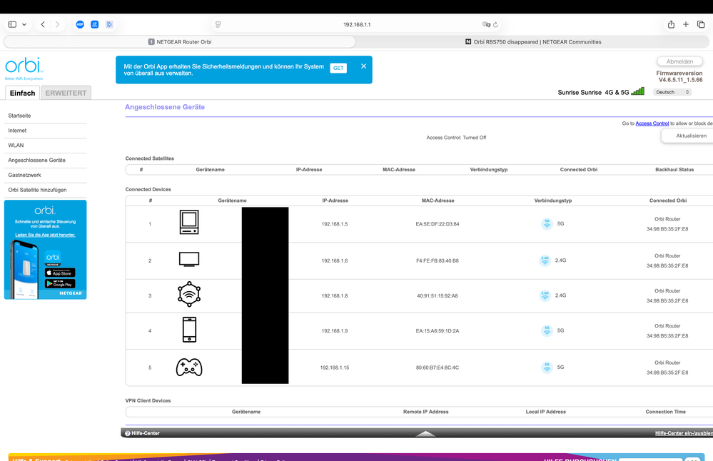 Thank you for your support. I've followed your steps exactly; unfortunately, no change. I reset both devices and configured the network again. However, the satellite does not appear in the list of connected devices and cannot be found during the setup, nor by trying to add the satellite later through the app or web interface of the router. See here: