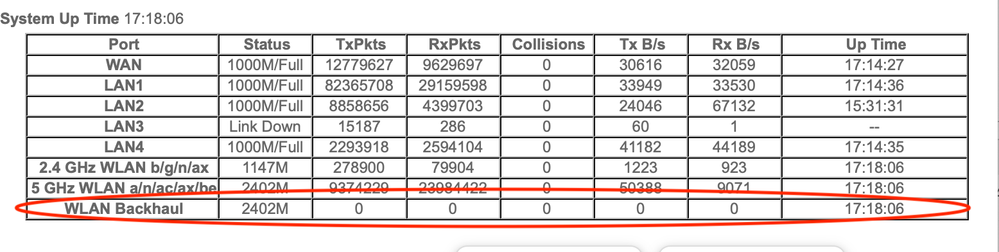 I swapped the locations of my RBSs. Got the same result–no 5 gHz backhaul. After that test, I brought an RBS into the same room as the RBR, placed it about 8 feet away, and powered it up while watching the web "Attached Devices" page. As the RBS finished syncing, it initially showed it was connected to the RBR via 5 gHz with a "Good" backhaul status. Within 60 seconds of noticing that, I watched the "Connection Type" change to 2.4 gHz and it stayed there. Absolutely zero WLAN Backhaul Tx/Rx Pkts listed on the System Statistics page (As per original post screenshot.).