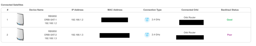 About 30 days ago, my otherwise rock-solid Orbi 850 system (RBR + 2 RBS) began to slow way down. After some troubleshooting, I noticed the backhaul was using 2.4 gHz, not the dedicated 5 gHz band and had gone from a daisy-chain config to a star mesh config. The farthest RBS ( about 75 ft from router) shows "poor" in the connection status. I did a factory reset and a reconfiguration from scratch yesterday via the web GUI (not the iOS app). I'm still getting no signals on the 5gHz backhaul (see attached screenshot). Any ideas?