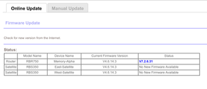 Firmware not there: RBK653 = RBR750 + 2x RBR350 I purchased the Netgear RBK653 kit (Router + two satellites) a year and a half ago. Two months ago, Netgear released a firmware update for the rout...