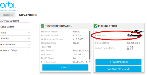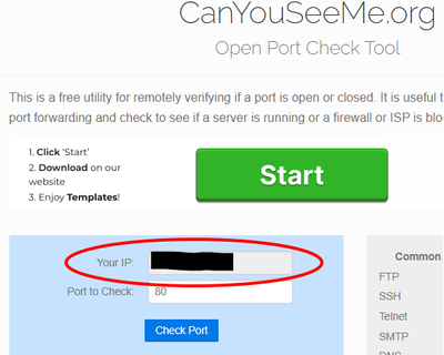 with the IP address shown by a web port scanner, such as https://canyouseeme.org/
