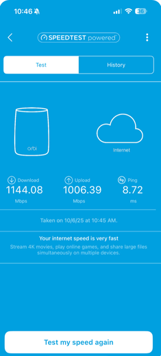 Orbi app on my phone measuring connection speed at RBR850 Router (removing WiFi connection) yields 1140Mb down/1000Mb up: