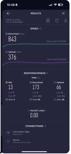 Speedtest app on my phone connected to RBR850 Router via WiFi yields 843Mb down/376Mb up: