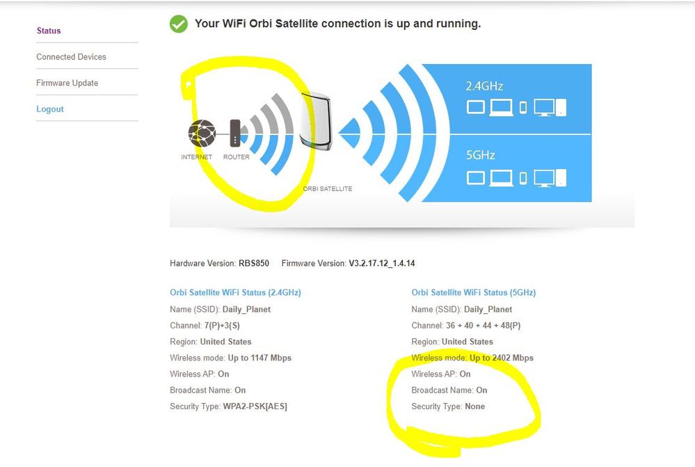 Now here is the odd part; I looked at each satellite's web GUI and each one had slightly different issues. Refer to the three attached images for the following