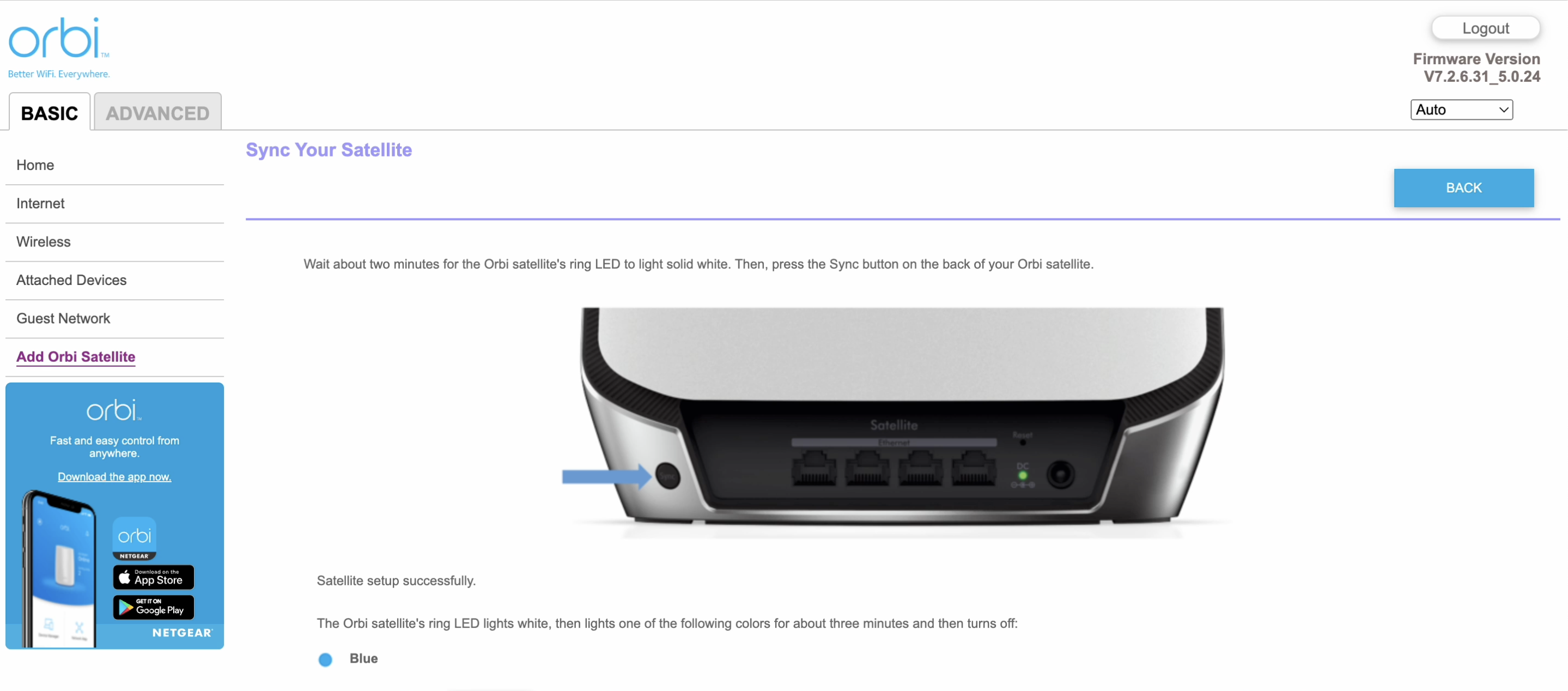 Navigate to orbilogin.com > "Add Orbi satellite" (Found under the basic tab).