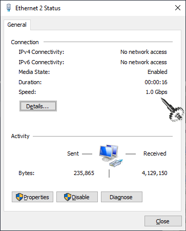 When you get to the home screen, connect 1 wired PC to the WAN port of the RBR. Open the networking adapter status window on this PC and check the connection speed seen here. The PC wont get an IP address however we are looking to see if the PCs adapter can see the connect rate on the WAN port. 1000Mpbs should be seen here I hope.