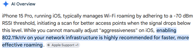 Thanks for the quick reply. (sigh) iPhone 15 Pro does not support WiFi7, so that is not likely to be relevant.