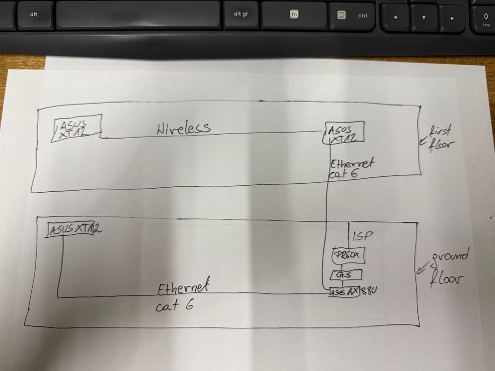 Unfortunately, the wiring has been brought to the most critical places, which is currently covered by the Asus Pro XT 12. The intention before the renovation and drilling into the walls was to run cables to the areas where the wifi was the weakest. And thatβs what I did. During the process, it turned out that Asus does not work stably with the configuration I wanted to achieve to reduce the mess of network cables. Initially, it was connected as I wanted to achieve with the Orbi system. However, after some time, it turned out that the connection is unstable and knocks out the entire wifi network, the mesh stops working, and it needs to be configured from the beginning. The Orbi appeared, but as you rightly pointed out, it is an expensive system, and before I bought it, I wanted to get confirmation that I would achieve what is shown in the drawing. Now I know that I won't do that. Of course, I can consider an AP now; however, the renovation assumed a different scenario, and now with the AP, there will again be a problem with visible cables :)