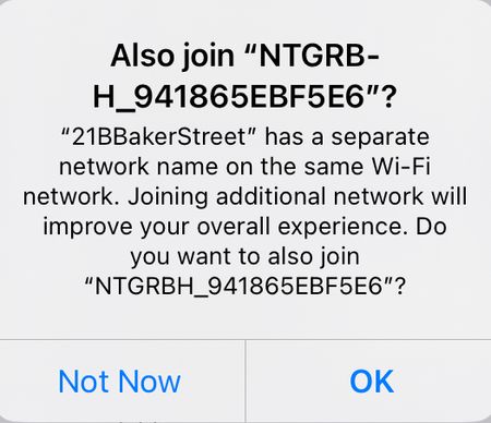 Three times, when playing around/testing a use case of forgetting my WiFi, then re-joining it, I got this message asking if I wanted to join what I think is the backhaul WiFi - and recommending it. A...