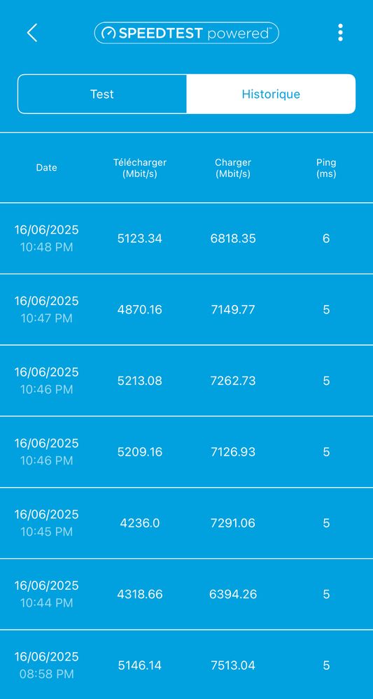 5 speed tests via Orbi app on iPhone 16 Pro Max: