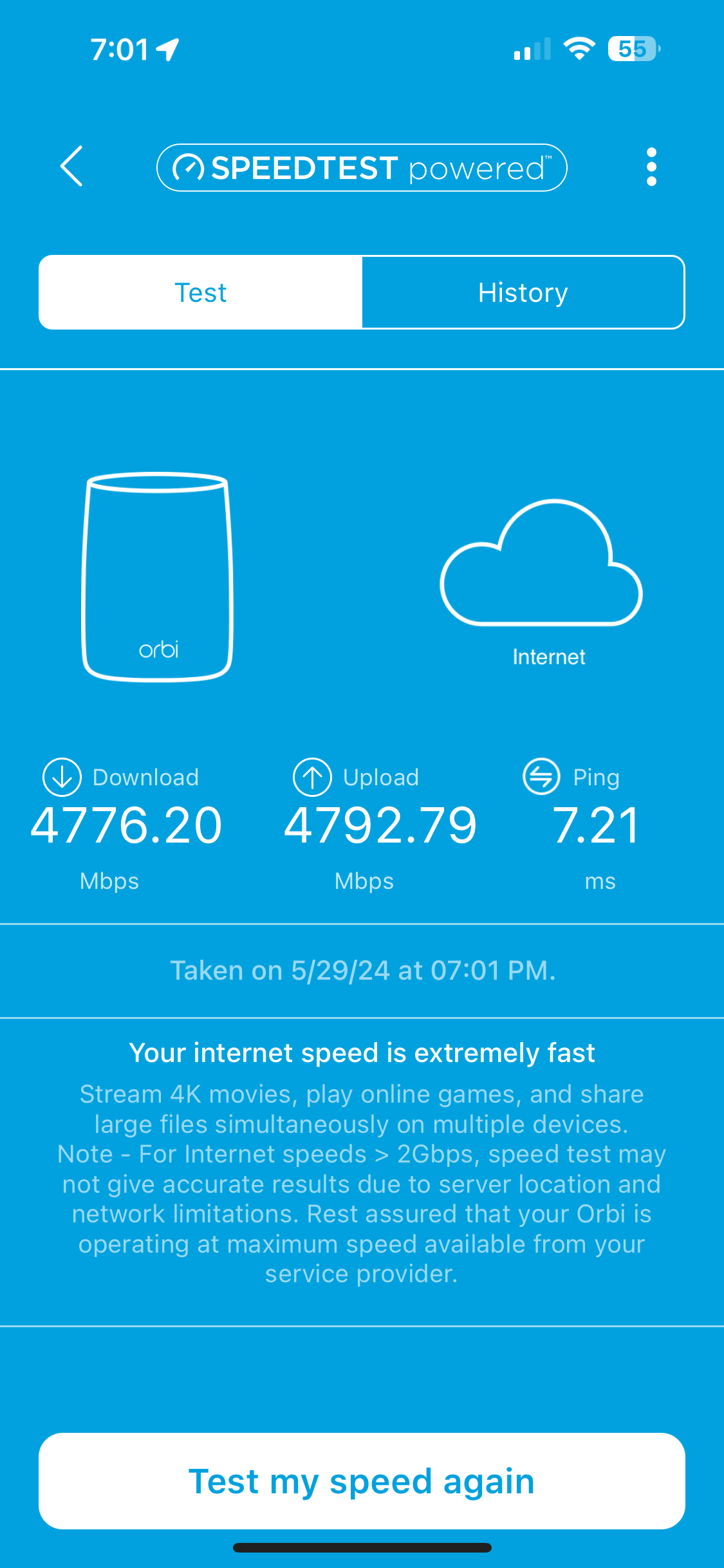 - Roc1May 29, 2024LuminaryBut that “extremely fast is a marketing lie!! If I could get my Orbi speed test from 9am this morning (4627 down and 935 up) to attach, it too says “Your internet speed is extremely fast” to!!! Sure they are, compared to my 1st internet service ADSL back in 1953!!!