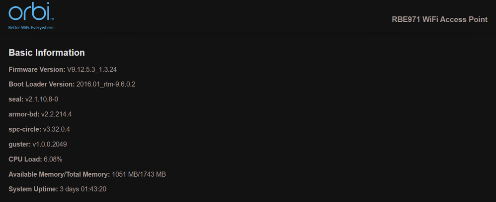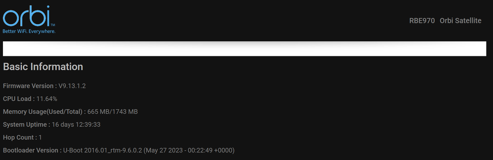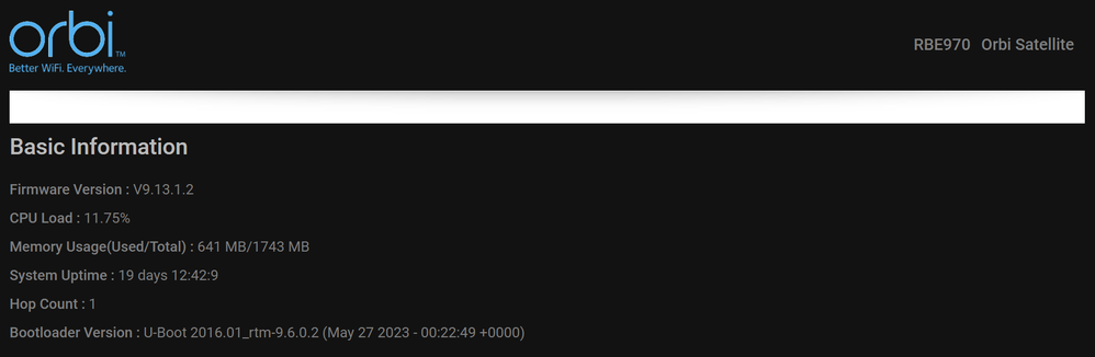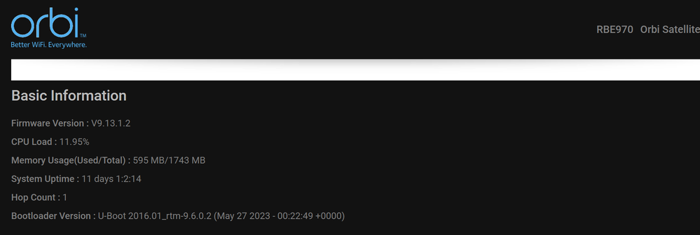 RBE970Orbi SatelliteBasic InformationFirmware Version :V9.12.5.3CPU Load :11.28%Memory Usage(Used/Total) :679 MB/1743 MBSystem Uptime :23 days 0:49:18Hop Count :1Bootloader Version :U-Boot 2016.01_rtm-9.6.0.2 (May 27 2023 - 00:22:49 +0000)RBE970Orbi SatelliteBasic InformationFirmware Version :V9.12.5.3CPU Load :11.68%Memory Usage(Used/Total) :621 MB/1743 MBSystem Uptime :23 days 0:50:7Hop Count :1Bootloader Version :U-Boot 2016.01_rtm-9.6.0.2 (May 27 2023 - 00:22:49 +0000) - FURRYe38Guru - Experienced User