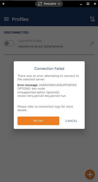 I removed the one line (dev-node) which eliminated the fatal error but now I simply continue to try to connect forever until timeout. The router external address and port is correct in both the app and router VPN settings. I tried changing the VPN Protocol setting to UDP rather than Adaptive since UDP is the protocol used by the router. I also tried changing Advanced settings from Legacy to Preferred with instant failure (key is too short).
