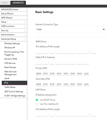 - microchip8Jul 16, 2023MasterWhy are you messing with fixed IPv6 addresses? Do you have any allocated by your ISP? Most residential customers have a DHCPv6 address allocated along with a prefix. You should use Auto-Detect or DHCP to fetch an IP address.