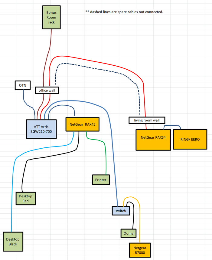 RAX54 (living room) supplies ethernet to a Ring/ Eero router. Also, all my wifi devices (cameras, smart plugs, thermostats, dehumidifiers, etc) are connected to this router.