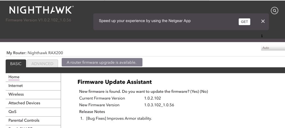 David1212 wrote:Netgear may have made a mistake in pushing out firmware 1.0.3.102_1.0.56 for the RAX200 router. This firmware is not listed on the Netgear Support site. This firmware is showing as an download on both the app and when logged in with a browser.