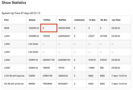 Hi, My RAX80 is runnign on V1.0.3.106_1.0.50 firmware. In statistics, I see WAN transmitted packes as 0. It makes no sense.