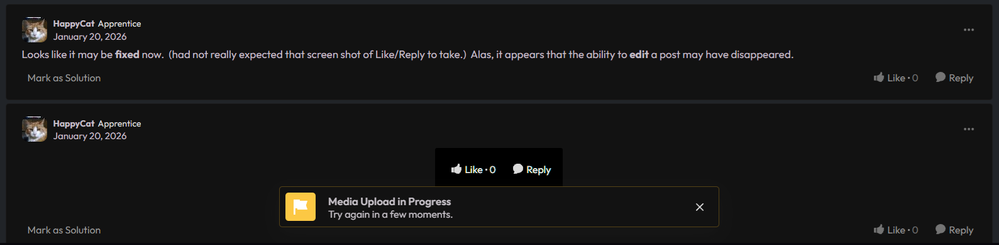 Looks like it may be fixed now. (had not really expected that screen shot of Like/Reply to take.) Alas, it appears that the ability to edit a post may have disappeared.