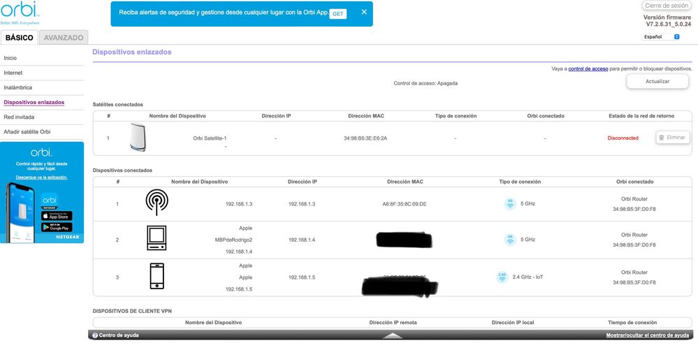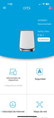 https://community.netgear.com/t5/Orbi/NETGEAR-RBK852-Sat%C3%A9lite-no-encontrado/m-p/2367467#M670) de restaurar ambos equipos (mantener apretado el botón oculto de atrás, hasta que aparece de color ámbar titilando) y configurar la red wifi desde cero, manteniendo ambos equipos en conexión por cable de red.
