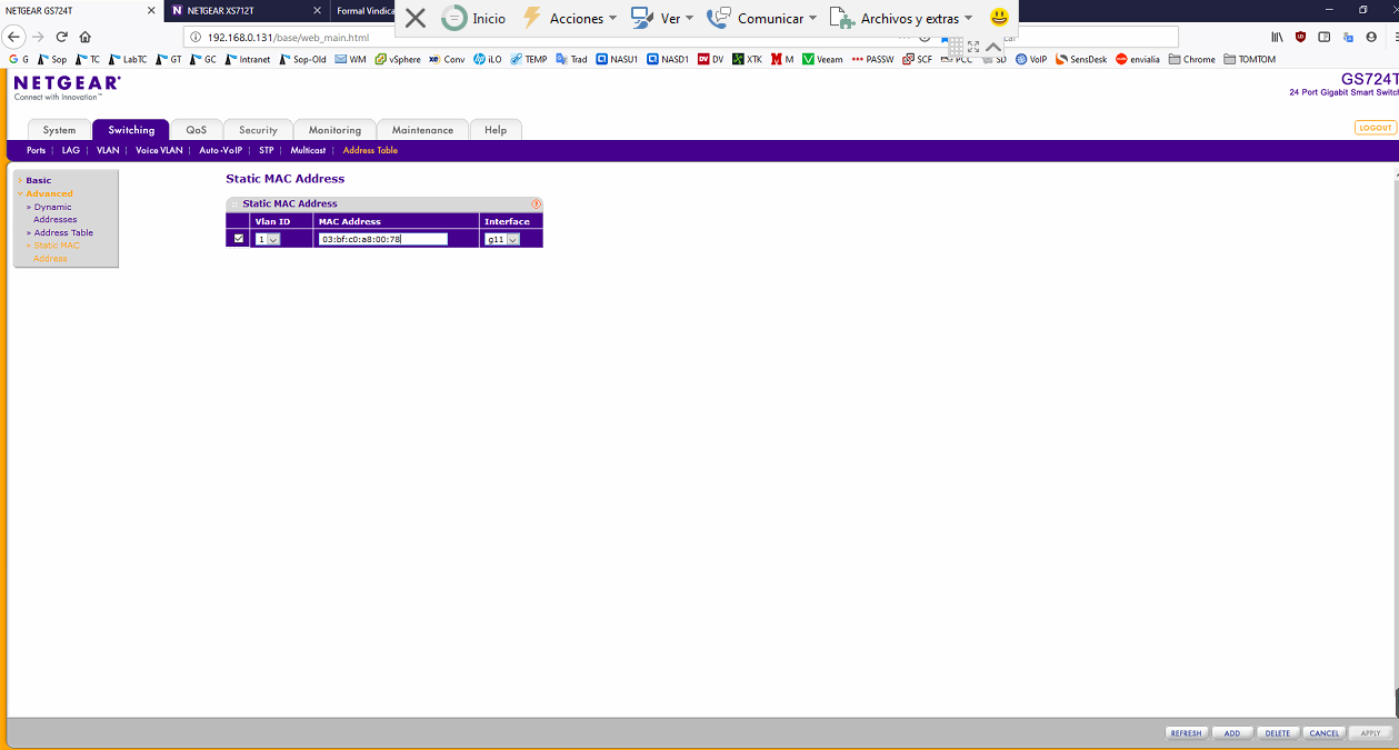 Hemos probado a configurar la entrada propuesta, y a la hora de añadir la entrada de la mac, en el primer puerto involucrado en el trafico, y en la vlan asociada, nos sale el error en un cuadro de dialogo: