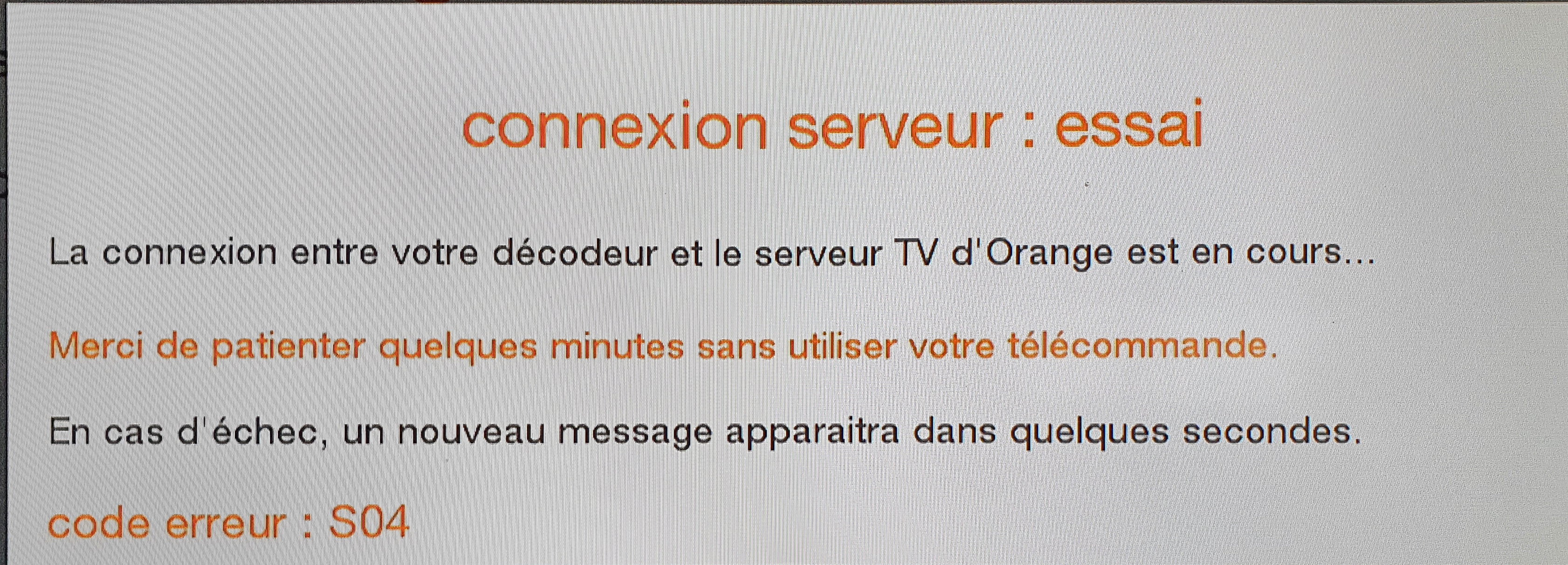 Cela marchait très bien depuis plus de 2 ans, mais depuis un peu plus d'un moi lorsque j'allume mon decodeur, il m'affiche une erreur S04 (photo en pièce jointe), jusque là j'avais trouvé comme parade de débrancher le cable réseau et je pouvais regarder la TV en mode dégradé ( plus de menu orange , plus de replay etc...),