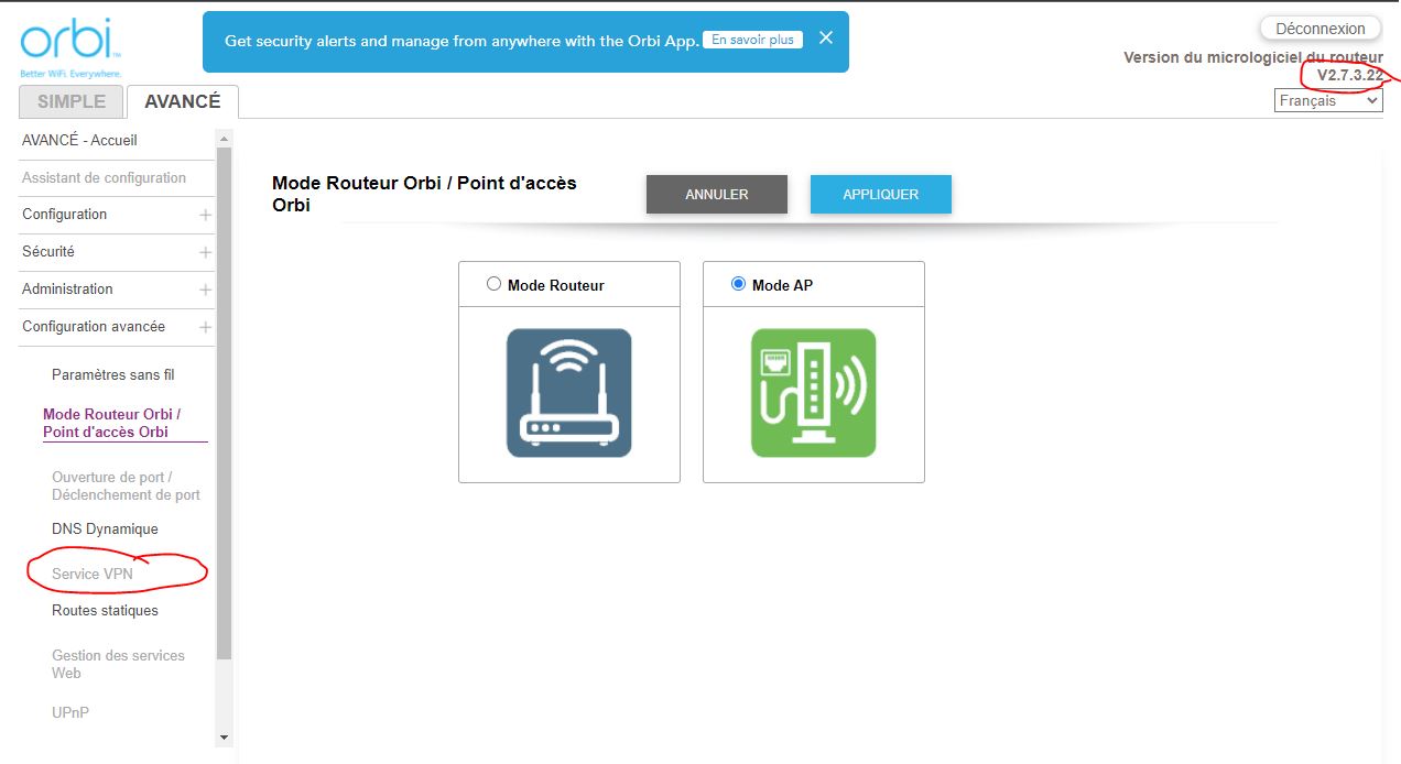 Pour l'instant, mon Orbi est branché en mode pont derrière une freebox revolution, mais j'ai essayé d'enlever le mode bridge, ça n'a rien changé à l'accès au paramètrage VPN Service dans le menu orbilogin...