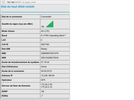 J'ai configurer avec une carte SFR multi surf 4G+ active sur mon R7100LG. Je me connecte (PC Win8.1) via ethernet ou wifi sur le routeur j'ai vérifie le routeur etat reseau 4 actif connecte OK Le r...