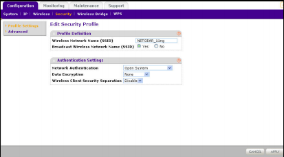 1. Sélectionnez Configuration> Sécurité. L'écran Modifier le profil de sécurité affiche:2. Entrez le nom du réseau sans fil (SSID) pour le réseau sans fil. Il est défini par défaut pour