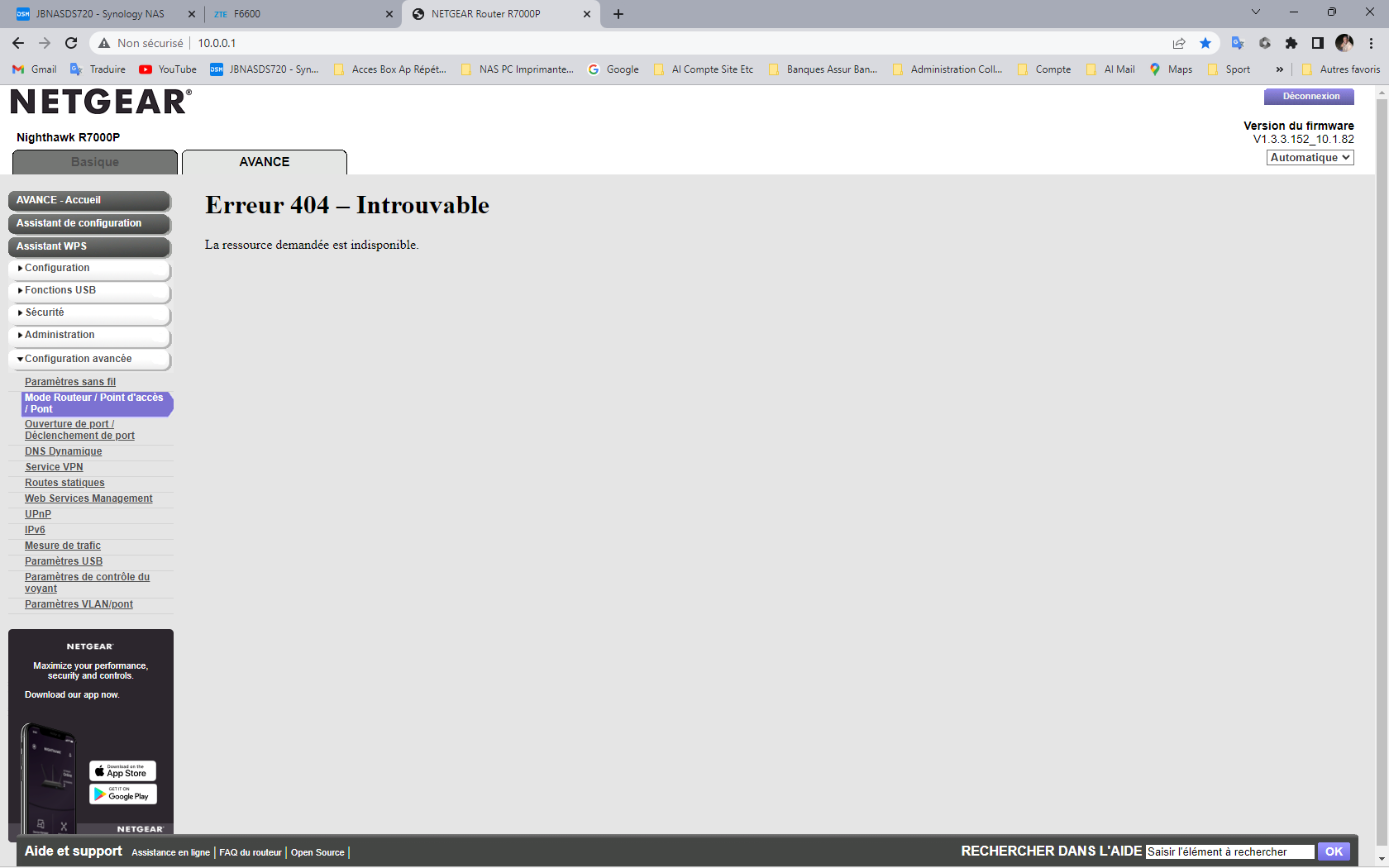 je me connecte sur le reseau du R7000P NETGEAR 52. et dans configuration avancee, j'ai comme choix Mode Routeur/point d'accès /pont