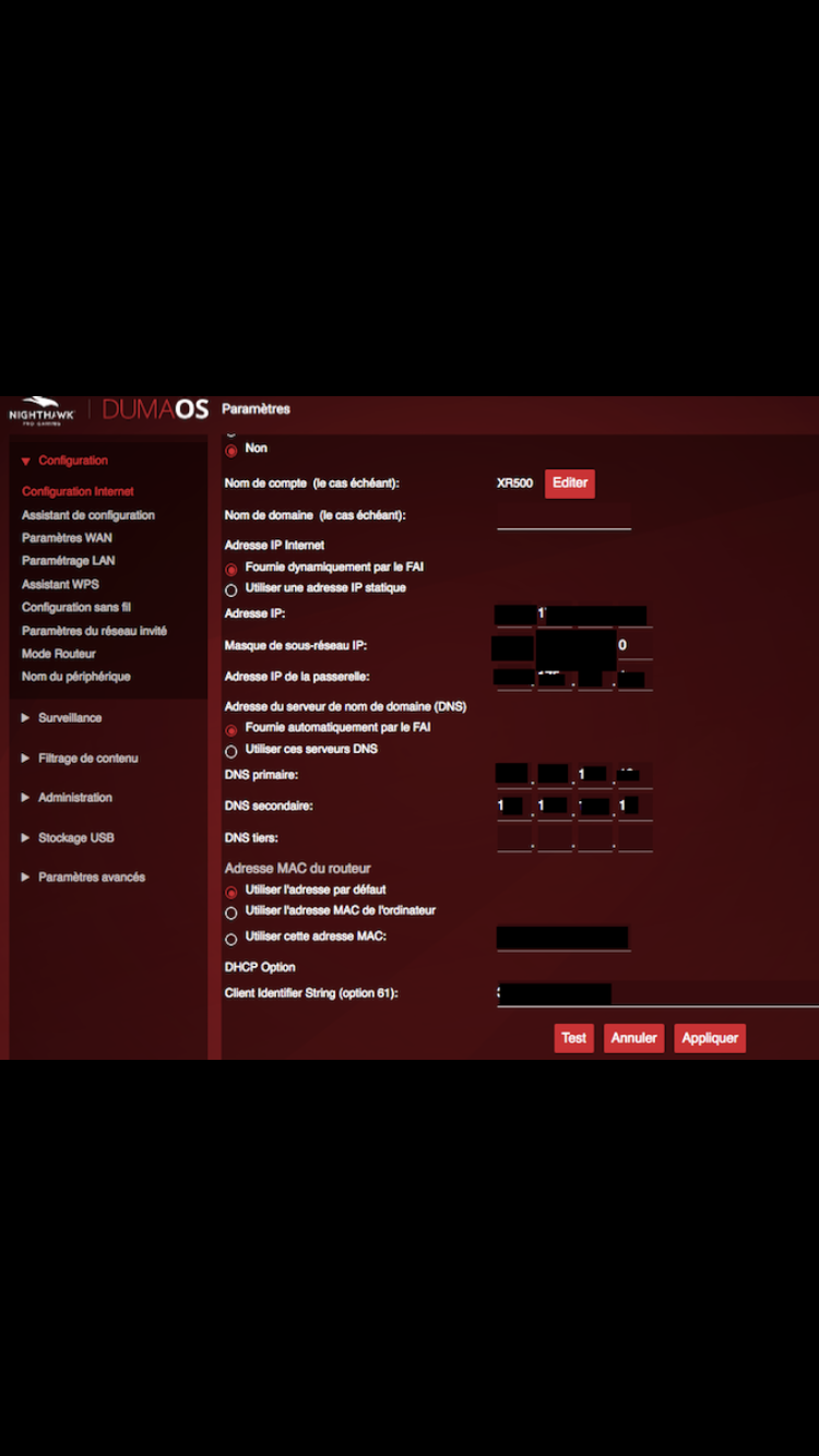Afin de brancher en direct le XR500 derrière mon ONT Fibre optique, j'ai besoin d'avoir l'option 60 (send vendor class) dans les option DHCP.