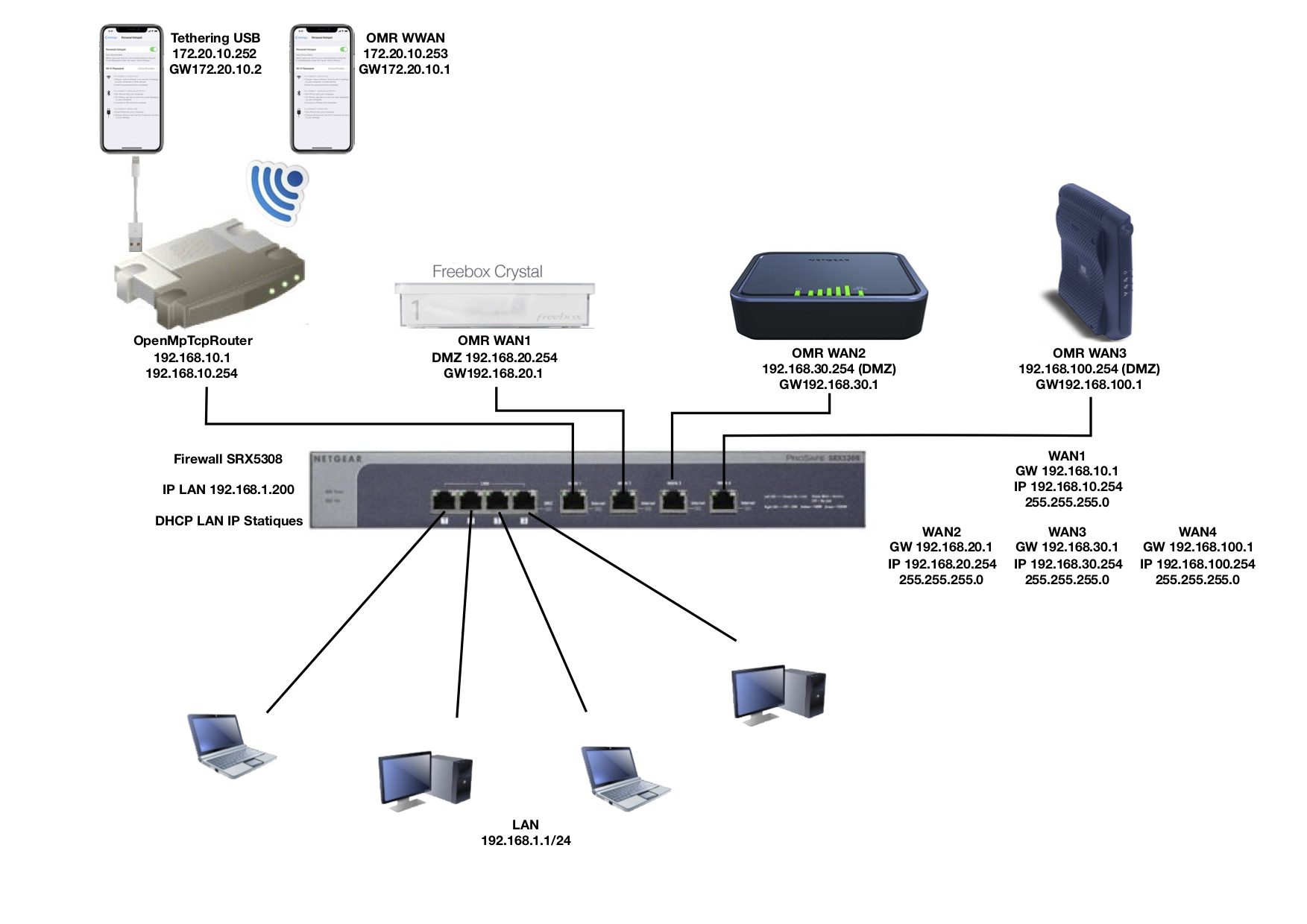 La structure finale sera un OpenMpTcpRouter (OMR) relié au WAN 1 - Une Freebox Crystal (FB) reliée au WAN2 - Un Modem 4G relié au WAN3 - Peut-être une liaison satellite sur le WAN4.