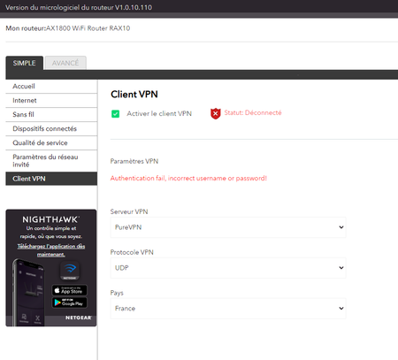 Authentification impossible avec PureVPN sur AX1800-RAX10